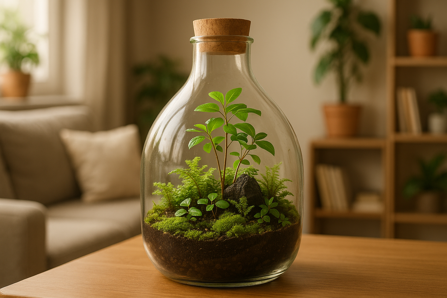Ein Flaschengarten ist ein in sich geschlossenes Mini-Ökosystem. Pflanzen, Erde, Feuchtigkeit und Luftzirkulation bilden ein natürliches Gleichgewicht. Du musst ihn kaum gießen – er pflegt sich fast ganz von selbst. Einfach hinstellen, genießen und zusehen, wie dein kleiner Dschungel wächst. 🌱